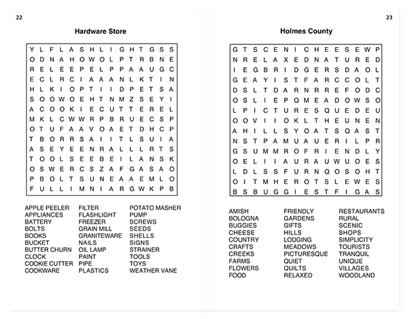 8.5 x 5.5 • 58 Word Find Puzzles featuring common words found and used in Amish Country.