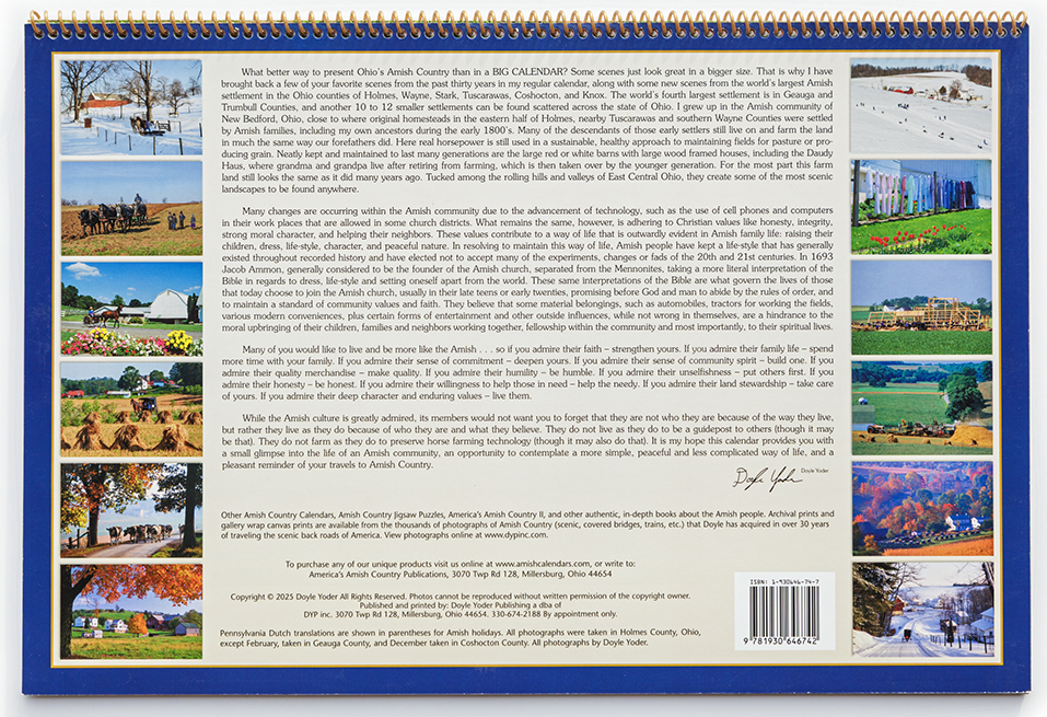 What better way to present Ohio’s Amish Country than in a BIG CALENDAR. Some scenes just look awesome in a big size. I have brought back, in this big size a few of your favorite scenes from past twenty seven years in my regular calendar along with some new scenes from the world’s largest Amish settlement in the Ohio counties of Holmes, Wayne, Stark, Tuscarawas, Coshocton, and Knox. Opens to 18" x 24".